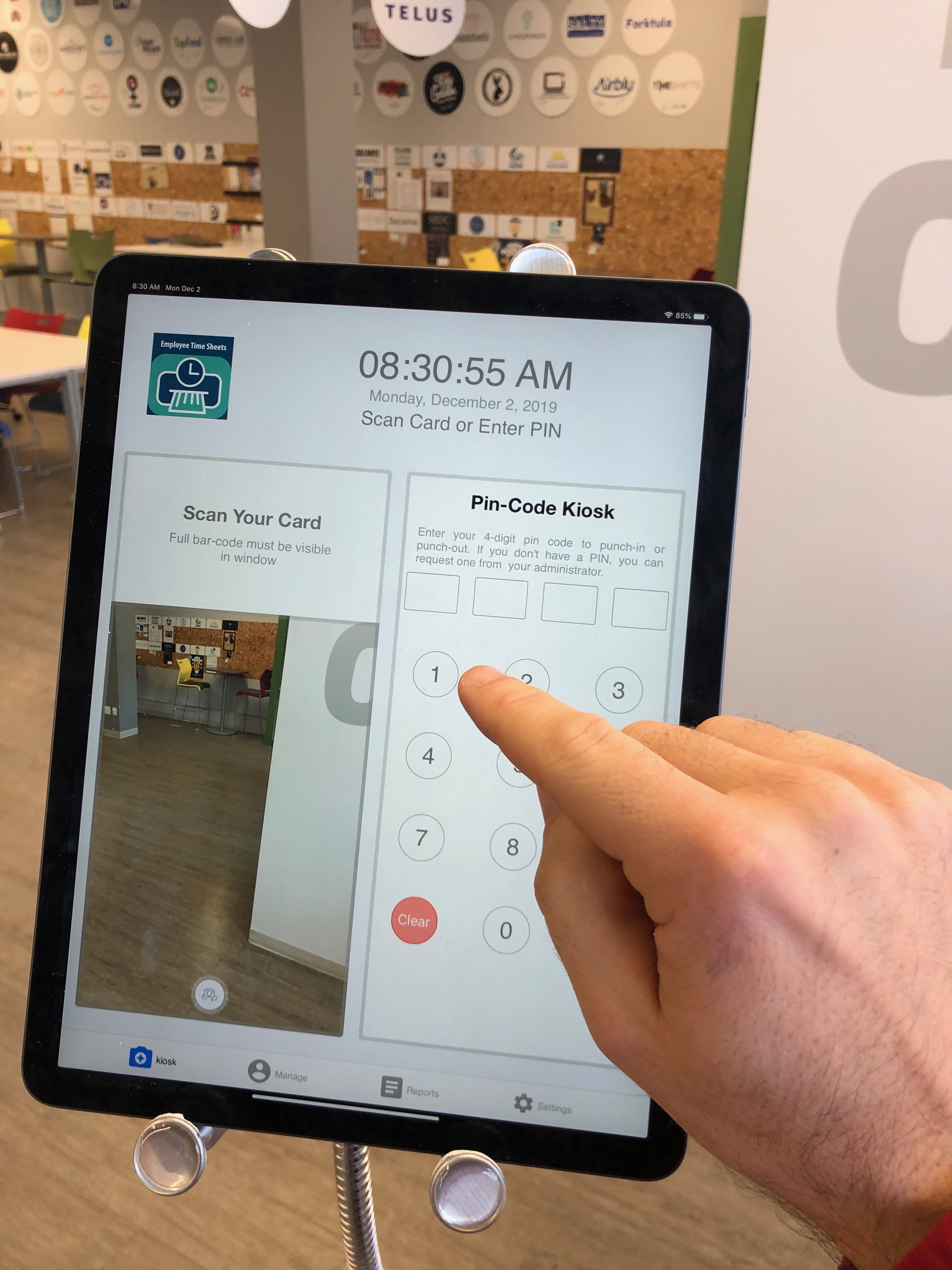The purpose of the kiosk is to have a device that employees can come and log in their time. Employees can now come and clock-in and clock-out to record their time.